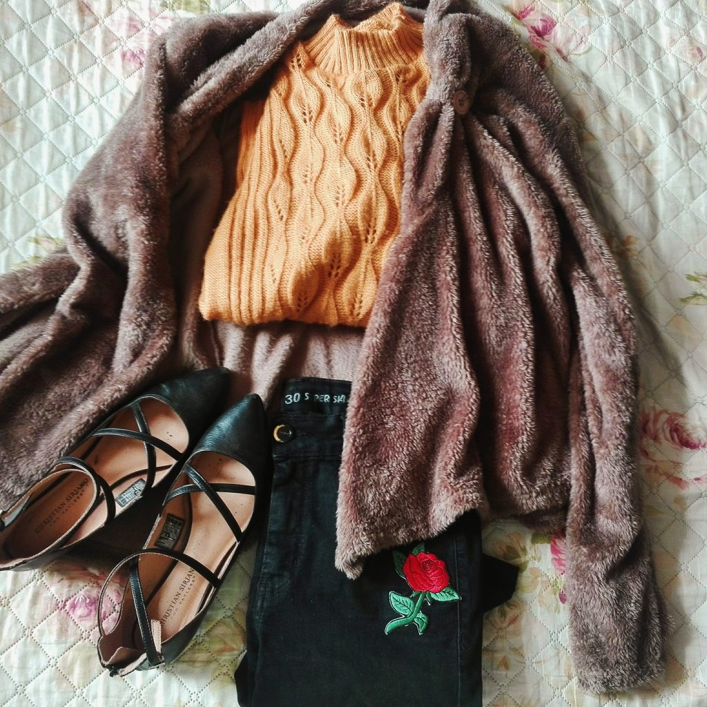 Y como hacía frío, usé encima del sweater una casaca faux fur beige que me obsequiaron, junto a un clásico sombrero negro ¡Y LISTO!