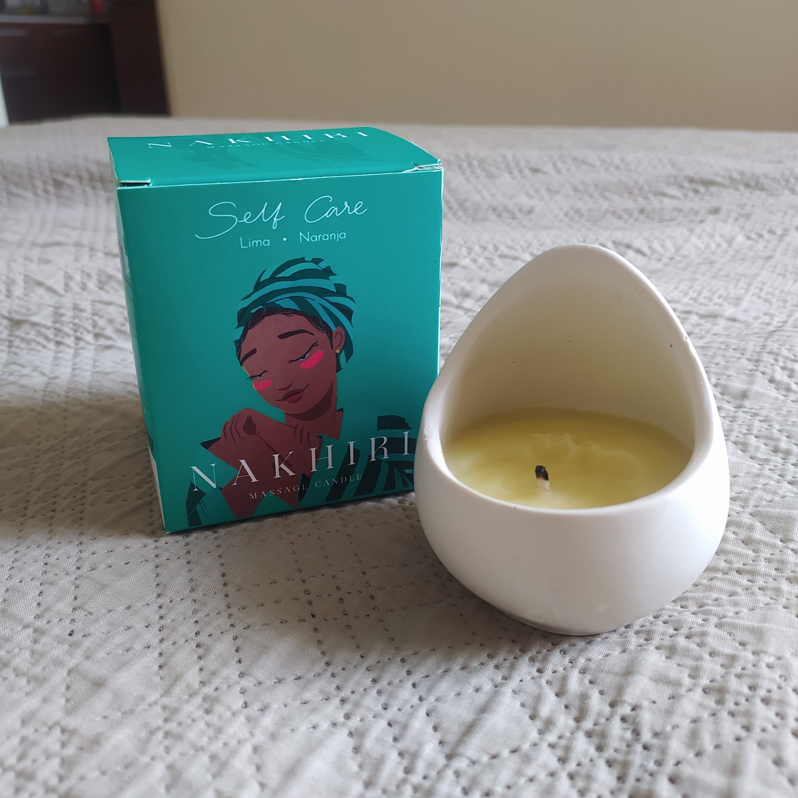 Por eso compré hace poco esta vela aromática y para masajes de Nakhiri. A diferencia de las velas convencionales, estas están hechas con ingredientes naturales que al derretirse, se convierten en aceites nutritivos que puedes usar en el cuerpo. En pocas palabras ¡puedes hidratar el cuerpo con la vela y SIN QUEMARTE!